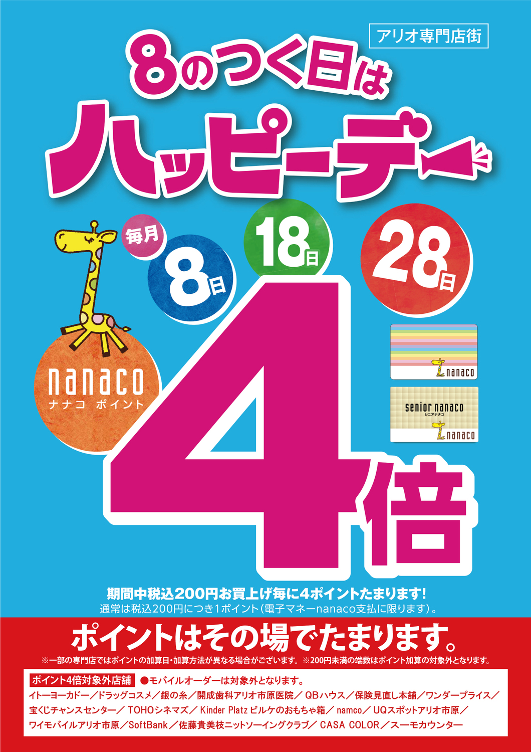 毎月8のつく日にアリオモール専門店にて電子マネーnanacoで