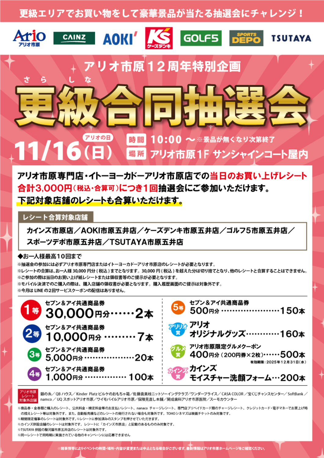 アリオ市原専門店・イトーヨーカドーアリオ市原店・カインズ市原店での当日のお買い上げレシート合計3,000円(税込・合算可)につき1回抽選会にご参加いただけます。