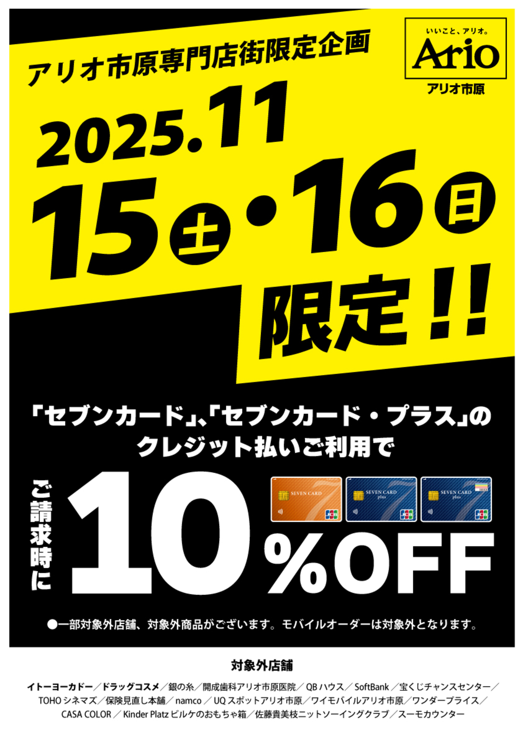 11月15日(土)・16日(日)にアリオ市原専門店街でのお買い物で、「セブンカード」「セブンカード・プラス」クレジット払いをご利用いただくと、ご利用代金請求時に10%OFF!