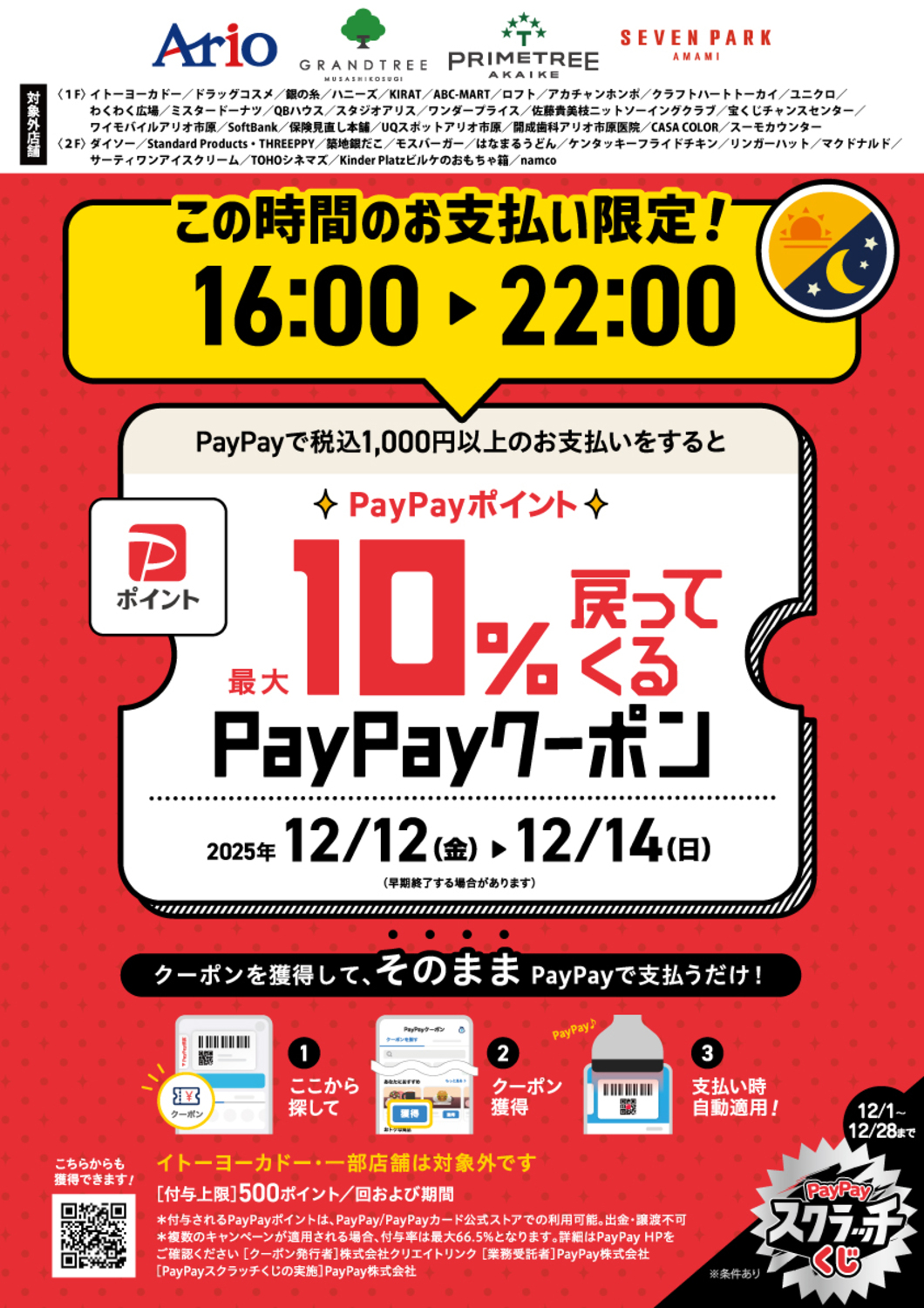 対象店舗にて16時~22時の時間にPayPayでお支払いすると最大10%PayPayポイントが戻ってくる!