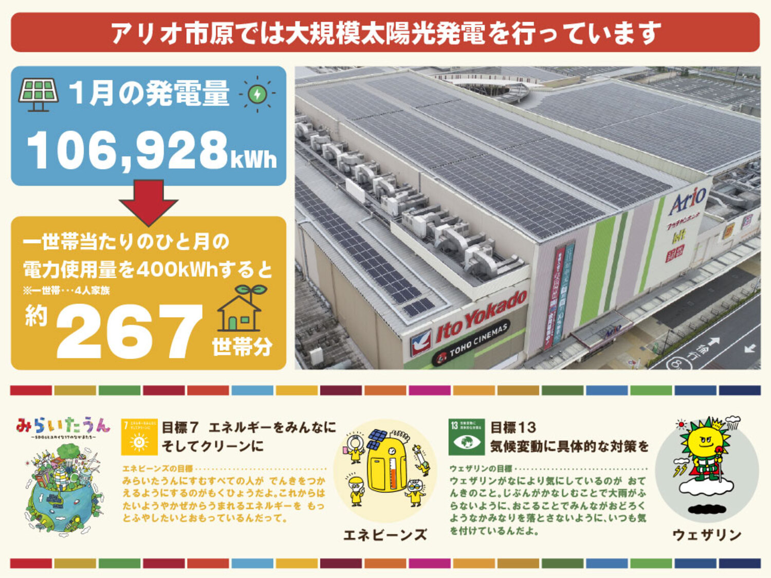 『アリオ市原』全体の電力使用量の約25%を太陽光パネルによる発電で賄うことが可能となり、それに伴い、使用電力におけるCO2排出量も約25%削減することができます。