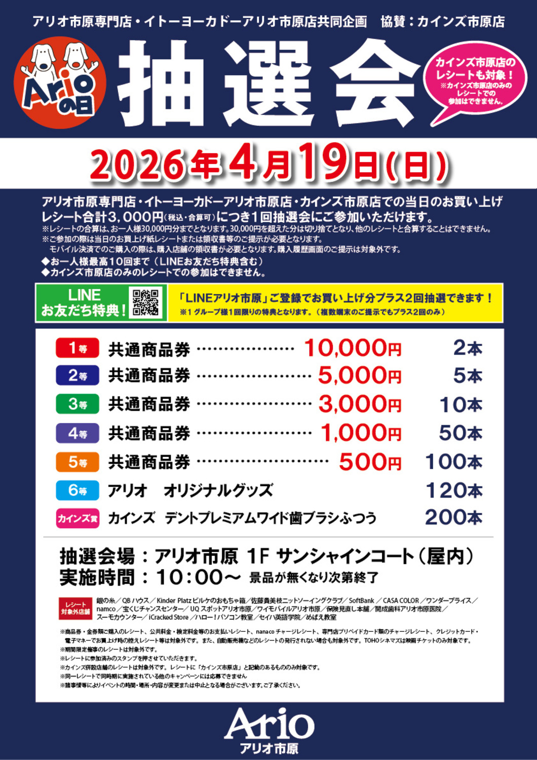 アリオ市原専門店・イトーヨーカドーアリオ市原店・カインズ市原店での当日のお買い上げレシート合計3,000円(税込)につき1回抽選会にご参加いただけます。