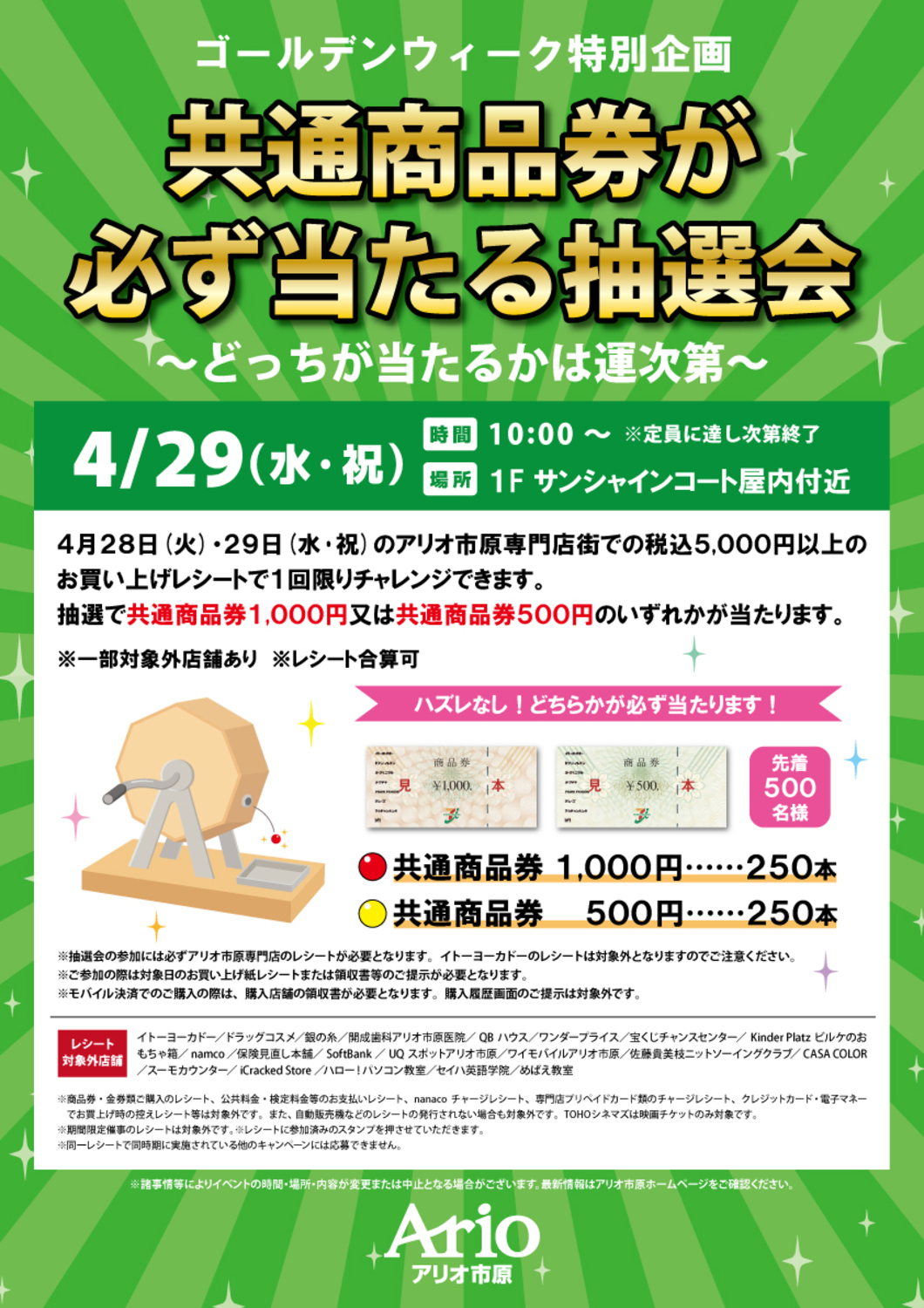 ※抽選会の参加には必ずアリオ市原専門店のレシートが必要となります。イトーヨーカドーのレシートは対象外となりますのでご注意ください。