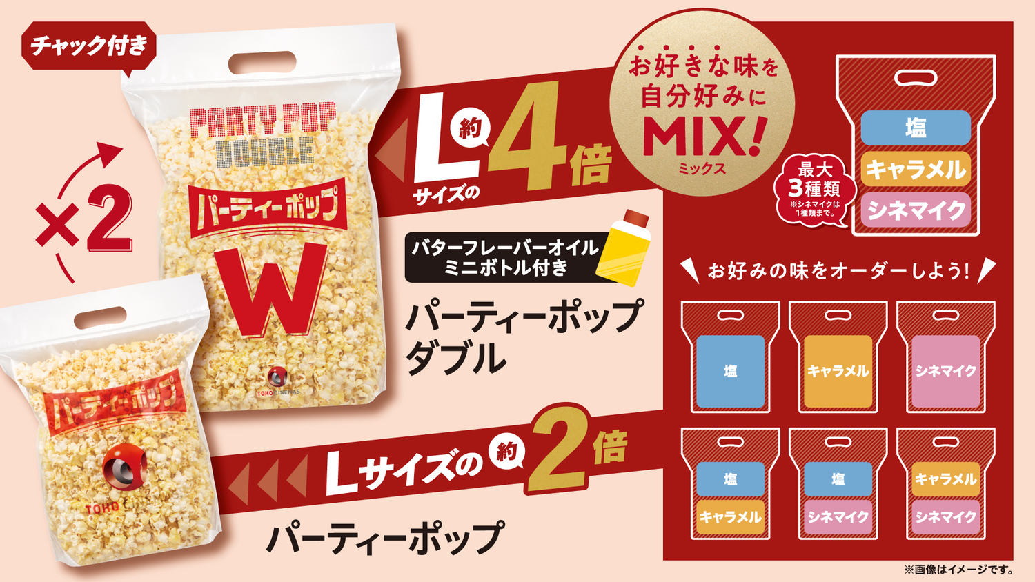 本商品は当社Lサイズポップコーンの約2倍(パーティーポップ)約4倍(Wパーティーポップ)の容量で、「塩」「キャラメル」「シネマイク」の最大3種類をお好みでお選びいただけます。